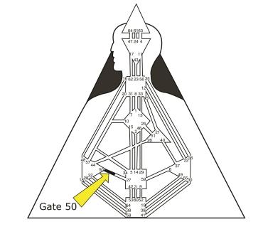 Gate 50, like all four gates in the Defense Circuit (50, 27, 59, 6), is an Aura Busting energy. This means that people who have predominantly Individual circuitry or predominantly Collective circuitry will more easily be drawn into Tribal energy and (temporarily) feel obliged to honor the rules of the tribe/family/community/workplace.