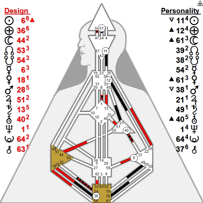 Tribally, he has the gates for Ambition (54), Principles (and revolution!) (49), the Treasurer (21), and the Warrior/Peacemaker (6), and so makes a wonderful father, romantic partner, and business partner.  Finally, as someone who has contributed mightily to the overall collective of humanity, he has the gates for Crisis (36), Correction (18), the Listener (13), and Ideas (11). Overall, it makes his outlook and persona balanced as well as unique.