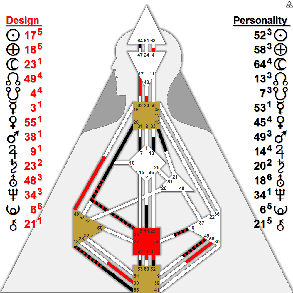 Thanks so much, Evelyn! Your readings are always so adroit and helpful. You stimulated me to look closer, and what especially stood out for me is that completely open Heart Center with it’s only possible activation (other than a complete channel transit or relationship) through the Money Channel with his Personality Venus in the 45 and his Chiron in the 21. It made sense to me that he might be “wired” or vulnerable to “prove” himself through that particular tribal expressions; that his inventions, energy, drive, ingenuity might powerfully show up through that financial expression. Also, I love looking at people’s Jupiters, what might be amplified in the chart. He just seems even further creatively resourced (14) to focus (9) on his innate ability to energize (34-20) his concentration and determination (9-52) towards exquisite precision (18-58) regarding things that center/ground him and substantiate his capacity for presence (Personality Sun (52)). You’re right, there is so much more to say. You’ve inspired me! Keep ’em coming!! Fun! THANKS!!!!!!