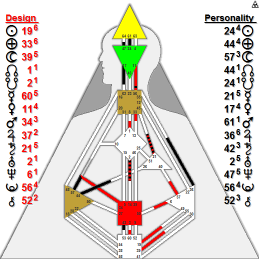 Below is Judy’s Human Design chart and my audio recording of a quick overview of her chart. The recording is not intended to be a thorough Reading –I could talk for several hours about a chart! I’ve simply pulled key aspects of this chart that really illuminate why she is the way she is.