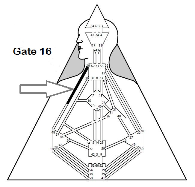 The Gate 16 is called the Gate of Skills and it exhibits enthusiasm. Part of the logical circuitry, it likes to experiment and to develop and hone skills through repetition and practice.