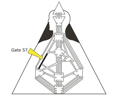 Gate 57 is also one of four Gates that form the complex channels called Integration. Closely related to Individual Circuitry, these energies bring change (mutation) through individual survival, living in the now, integrating awareness over time, and generally having little concern for impact on others.